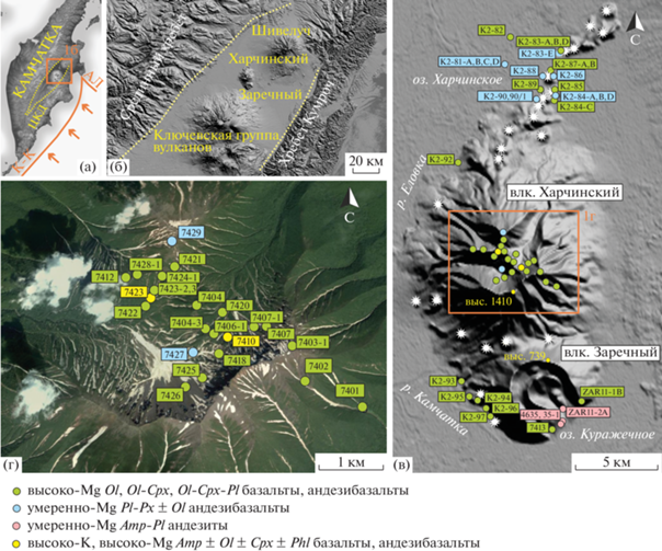 Вулкан Заречный (абс. выс. 739 м) расположен на южном склоне влк. Харчинский (см. рис. 2а). Его постройка состоит из внешнего конуса, разрушенного подковообразным кратером диаметром около 3.5 км. В центре кратера находится внутренний конус, который, согласно (Волынец и др., 1998), разрушен кратером обвального или обвально-взрывного происхождения и вмещает фрагменты экструзий. Немногочисленные обнажения вдоль берега р. Камчатка и вершинного гребня, а также на восточном подножии вулкана вскрывают потоки базальтовых лав и прослои шлаков, которые слагают внешний конус влк. Заречный.