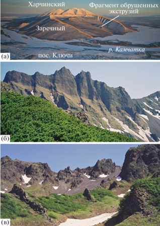 Вулкан Харчинский (абс. выс. 1410 м) – существенно лавовый стратовулкан, площадь которого составляет 150 км2, а объем выраженной в рельефе постройки около 60 км3 (Волынец и др., 1998). Центральная часть вулкана разрушена в результате воздействия позднеплейстоценовых ледников, а также вулкано-тектонических и обвальных процессов. В настоящее время в вершинной части постройки сформирован цирк диаметром около 4 км. Восточные стенки цирка практически вертикальны и демонстрируют верхнюю часть лавово-пирокластического разреза мощностью около 600 м (рис. 2б).