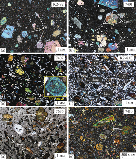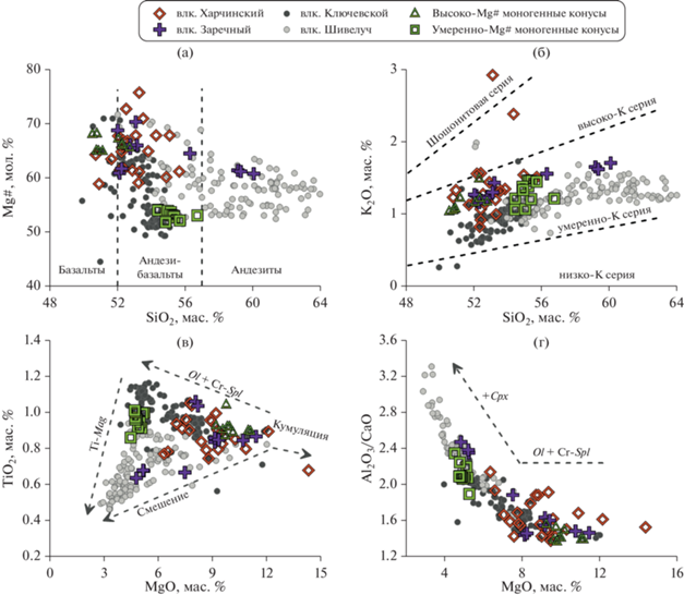 Широкий интервал составов вкрапленников оливина и клинопироксена (от 70.4 до 92.6 мол. % и от 72.6 до 91 мол. %, соответственно), серийно-порфировая структура пород, наличие гломеропорфировых сростков и зональных кристаллов клинопироксена (рис. 3) и особенности валового состава пород (рис. 4) указывают на значимую роль процессов кумуляции кристаллов и смешения магм наряду с процессами фракционной кристаллизации при эволюции магм вулканов Харчинский и Заречный в коровых условиях.