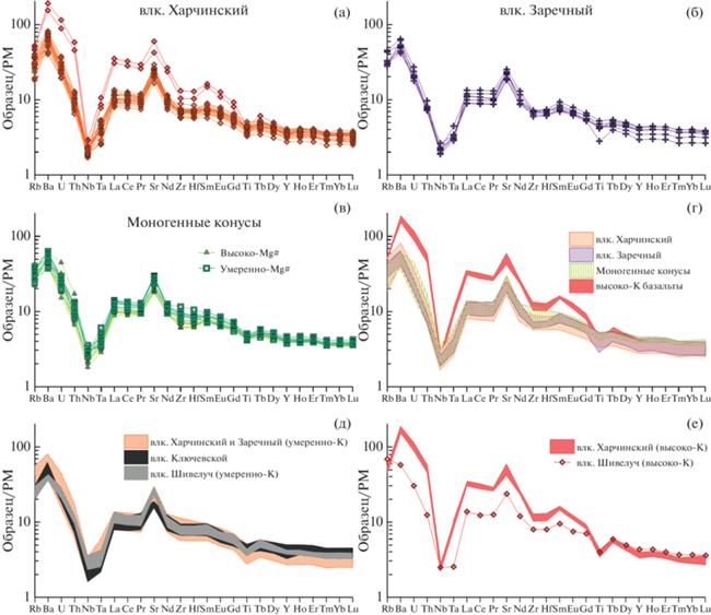 Происхождение высоко-K Amp ± Ol ± Cpx ± Phl базальтов и андезибазальтов влк. Харчинский вызывает отдельный интерес в силу их уникальной для современных вулканитов Камчатки геохимической специфики. Они характеризуются высокими абсолютными и относительными содержаниями легких редких земель (до 24 г/т La и до 57 г/т Ce, La/Yb до 15, La/Nb до 13.5), Sr (до 1240 г/т, Sr/Yдо 68), Ba (до 1300 г/т, Ba/Nb до 680), Th и U (до 4.8 и 2.4 г/т, соответственно). Средние значения La/Yb (4.33 ± 0.6), La/Nb (4.47 ± 0.52), Sr/Y (28.5 ± 4.7) и Ba/Nb (237 ± 62) для изученных пород вулканов Харчинский и Заречный близки к таковым для других четвертичных вулканитов Камчатки (4.05 ± 2.1, 3.54 ± 0.89, 16.8 ± 7.7 и 166 ± 96, соответственно, по базе данных GEOROC). Еще одной важной особенностью высоко-K пород влк. Харчинский является то, что именно эти породы содержат множество коровых и мантийных ксенолитов (Секисова и др., 2021; Siegrist et al., 2019, 2021).