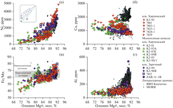 На данный момент аномально высокое содержание Ni (>3500 г/т) в оливине вулканов Камчатки было описано только для трех объектов: (1) высокомагнезиальные андезиты хребта Кумроч (Nishizawa et al., 2017) и (2) Шишейского комплекса (Bryant et al., 2011), а также (3) базальты извержения влк. Шивелуч 3600 14С лет назад (Горбач, Портнягин, 2011). Однако каждый из этих объектов имеет существенные отличия от изученных образцов вулканов Харчинский и Заречный. В случае хребта Кумроч, обогащенный Ni оливин встречается только в высокомагнезиальных андезитах и не встречается в высокомагнезиальных базальтах, которые также были описаны в данной области (Nekrylov et al., 2022; Nishizawa et al., 2017). В Шишейском комплексе высоко-Ni оливин был описан только в магнезиальных андезитах (Bryant et al., 2011). Извержение влк. Шивелуч 3600 14С лет назад представлено Ol-Amp-Cpx-Phl высококалиевыми базальтами (Волынец и др., 1997), тогда как образцы с высоконикелистым оливином вулканов Харчинский и Заречный относятся к умеренно-калиевой серии.