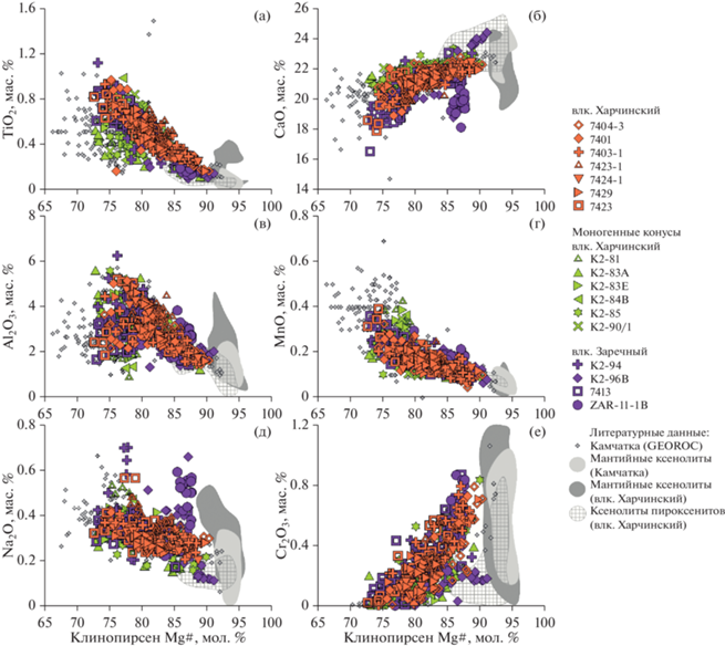 По содержаниям Al2O3 и MnO вкрапленники Cpx не проявляют каких-либо значимых специфических различий между образцами вулканов и отдельными образцами. Их состав закономерно изменяется в соответствии с вкрапленниками Cpx других вулканов Камчатки (по базе данных GEOROC, рис. 7в, 7г).