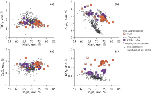 K2O является единственным компонентом, по которому вкрапленники амфибола изученных образцов существенно различаются. Среднее содержание K2O в амфиболе образцов вулканов Харчинский и Заречный составляет 0.9 и 0.5 мас. % соответственно (рис. 8г). По содержанию этого компонента изученные амфиболы систематически более обогащены по сравнению с амфиболами из андезитов влк. Шивелуч, что особенно характерно для высокомагнезиальных амфиболов с Mg# > 72 мол. %.