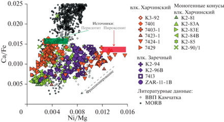 На основании соотношений Ca/Fe и Ni/Mg в оливине изученные образцы можно разделить на два основных тренда эволюции, стартовые точки которых, вероятнее всего, определяются различием источников расплавов (рис. 9). К первому тренду эволюции состава оливина относится большая часть образцов влк. Харчинский и часть образцов моногенных конусов с повышенным стартовым содержанием Ca и низкой концентрацией Ni, что характерно для перидотитового источника. Второй тренд выделяется для двух образцов 7423-1 и 7424-1 влк. Харчинский, имеющих наименьшее стартовое содержание Ca и наибольшую концентрацию Ni (рис. 9), что интерпретируется нами как тренд эволюции состава оливина, кристаллизующегося из расплавов преимущественно пироксенитового источника. Состав оливина всех образцов влк. Заречный и части образцов моногенных конусов (обр. K2-83А и K2-85) характеризуется промежуточным положением между двумя трендами эволюции (рис. 9), что может говорить о смешанном перидотит-пироксенитовом источнике расплавов для этих пород.