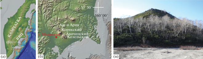 Лавовый конус горы Медвежья (53.236° с.ш., 158.676° в.д.) расположен в пределах Авачинской группы вулканов Восточного вулканического пояса Камчатки (рис. 1а). Эта группа вулканов включает действующие вулканы Авачинский и Корякский, потухшие вулканы Козельский, Ааг и Арик, а также ряд шлаковых и лавовых конусов (Пузанков, 1990; Масуренков и др., 1991; Krasheninnikov et al., 2020). Гора Медвежья находится в 8 км на юго-запад от Авачинского перевала на правом борту долины р. Сухая Речка (рис. 1б, 1в) и имеет абсолютную отметку 613.7 м и относительную высоту около 80 м. По данным С.П. Крашенинникова с соавторами, тефра, связанная с извержением горы Медвежья, имеет возраст 13.1 тыс. лет (Krasheninnikov et al., 2020). Образцы лав горы Медвежья были отобраны в коренных обнажениях вблизи вершины и на северо-восточном склоне.