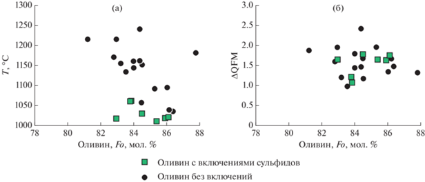 Редокс-условия кристаллизации, рассчитанные по модели (Николаева и др., 2016), для обоих популяций оливина практически не различаются и составляют ΔQFM = 1–2 для большинства определений (рис. 10б, табл. 4).