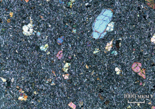 Базальты горы Медвежья. Фотографии сделаны на оптическом микроскопе в проходящем свете, николи скрещены. Вкрапленники в шлифе представлены оливином.