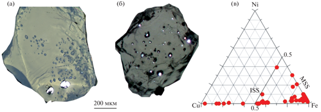 Фрагменты вкрапленников оливина с сульфидными включениями. Микрофотографии сделаны на оптическом микроскопе: (а) – в режиме свободного фокуса в отраженном свете, (б) – в проходящем и отраженном свете одновременно, (в) – индивидуальные анализы сульфидных фаз во включениях в оливинах на графике мольных долей Cu-Fe-Ni. MSS (monosulfide solid solution) – Fe-Ni фаза – моносульфидный твердый раствор, ISS (intermediate solid solution) – Fe-Cu-Ni фаза – промежуточный твердый раствор.