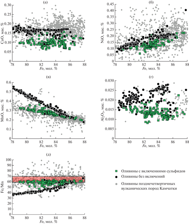 Вкрапленники оливина в базальтах горы Медвежья варьируют по составу от Fo78.2 до Fo87.8 (Supplementary, ESM_2). Вариации содержаний элементов-примесей (Са, Ni, Mn, Al) в зависимости от магнезиальности для оливина с включениями сульфидов и оливина без включений показаны на рис. 4. Вкрапленники оливина демонстрируют отчетливую бимодальность по содержанию СаО. В группе низко-Са оливина содержание CaO < < 0.12 мас. %, а в высоко-Са группе >0.12 мас. % (рис. 4а). Практически все оливины низко-Са группы содержат сульфидные включения (около 1.5% всех вкрапленников), а высоко-Са оливины (около 98.5%) таких включений не содержат. Кроме разного содержания кальция, зерна оливина с сульфидом и без сульфида имеют систематически различные содержания никеля, марганца, хрома и алюминия (табл. 2). Зерна низко-Са сульфидсодержащего оливина содержат меньше всех перечисленных компонентов по сравнению с бессульфидными зернами при близкой магнезиальности (рис. 4а–4г). Отличительной особенностью бессульфидного высоко-Са оливина в базальтах горы Медвежья является высокое содержание марганца (до 0.56 мас. % MnO в наименее магнезиальных зернах) (рис. 4в). Это наибольшие значения MnO из всех составов оливина вулканических пород Камчатки (Nekrylov et al., 2018). При этом низко-Са оливин с сульфидами (в базальтах горы Медвежья) показывает содержания, типичные для оливина вулканических пород Камчатки (0.20–0.36 мас. % MnO). Высоко-Са оливин в изученных базальтах отличается также четким трендом понижения величины Fe/Mn (рис. 4д) с уменьшением магнезиальности в область значений Fe/Mn < 40, которые не типичны для оливина из других базальтов Камчатки и также для оливина, кристаллизующегося из магм, имеющих перидотитовый мантийный источник (Fe/Mn = 60–70; Herzberg, 2011).