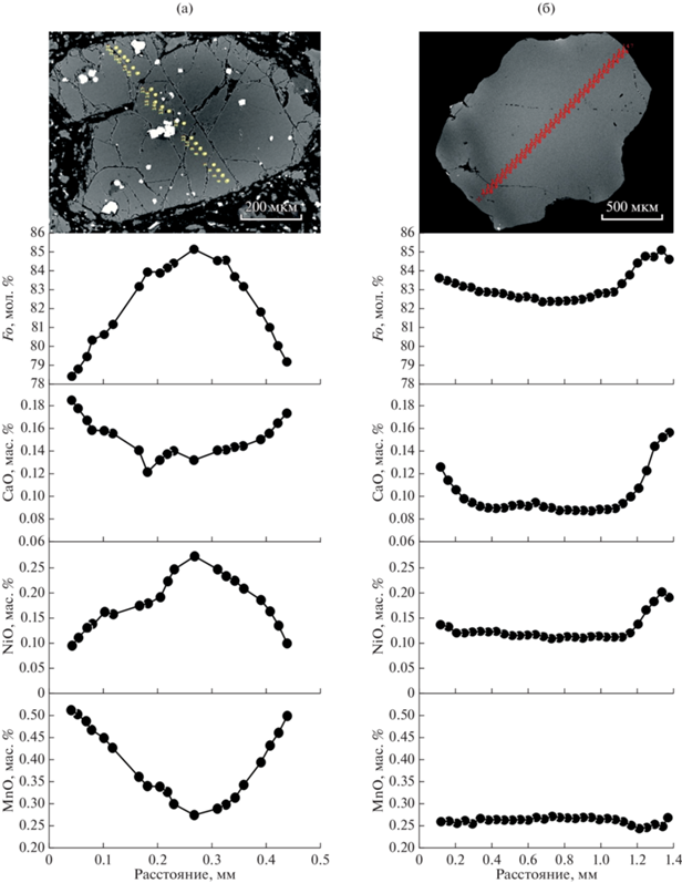 Зерна оливина с включениями сульфидов и без сульфидов различаются также характером зональности (табл. 2, рис. 5, 6). Высоко-Са вкрапленники оливина без сульфидов характеризуются прямой зональностью – имеют более магнезиальное ядро и менее магнезиальную периферию (рис. 5а). Низко-Са вкрапленники оливина, содержащие сульфидные включения, обладают более сложной, как правило, обратной зональностью. Ядра вкрапленников не зональны или слабозональны и имеют меньшую магнезиальность, чем их краевая часть (рис. 5б, 6). В некоторых зернах имеется узкая внешняя каемка с меньшей магнезиальностью. В зернах оливина без сульфидов наблюдается слабый рост содержания СаО при понижении Fo оливина. Во вкрапленниках оливина, содержащих сульфидные включения, от центра к периферии наблюдается рост содержания CaO в узком интервале значений Fo, так что краевые части зерен имеют состав, близкий к вкрапленникам оливина без сульфидных включений. Зональность по никелю аналогична поведению магнезиальности (рис. 5). В бессульфидных зернах оливина с прямой зональностью содержание никеля снижается от ядра к краю, а в сульфидсодержащих зернах наблюдается обратное распределение – концентрация никеля растет в краевых зонах кристаллов. По содержанию MnO оливин с сульфидом не зонален, без сульфидов – зонален с возрастанием содержания от центра к периферии (рис. 5).