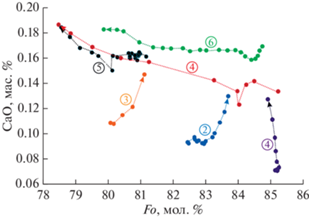 Ключевой особенностью вкрапленников низко-Са оливина является наличие обратной зональности в кристаллах разного состава, причем в краевых частях этих кристаллов состав оливина приближается к преобладающему в породах высоко-Са оливину (рис. 6). Важной особенностью этих ксенокристов также является наличие включений сульфидов и относительно глиноземистой шпинели по сравнению с включениями этого минерала в оливине высоко-Са группы. Особенность зональности кристаллов низко-Са группы позволяет предположить, что они были захвачены магмами в результате дефрагментации существенно затвердевших пород – оливиновых кумулатов – и испытывали частичное переуравновешивание с транспортирующими их магмами. В данном случае мы не видим явных признаков смешения магм, содержащих фенокристы оливина разного состава. В случае смешения магм контрастного состава можно было бы ожидать встречной и обратной зональности в направлении низко-Са составов в оливинах основной популяции. Однако эти оливины демонстрируют нормальную зональность с плавным повышением содержания СаO с уменьшением магнезиальности оливина (рис. 5, 6).