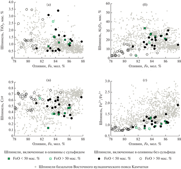 Минералы группы шпинели присутствуют в изученных образцах в виде включений в оливине и отдельных редких вкрапленников. Состав кристаллов шпинели, заключенных внутри вкрапленников оливина, приведены в табл. 3 и показаны на рис. 7. Шпинель, заключенная в зернах оливина с сульфидами, отличается несколько пониженной хромистостью (Cr# = Cr/(Al + Cr) = 0.14–0.48) по сравнению со шпинелями в бессульфидных зернах (Cr# = 0.30–0.77) (рис. 7в, табл. 4). Окисленность шпинелей, заключенных в этих двух группах оливина, практически не различается (рис. 7г), Fe2+/Fe3+ = 0.85–1.92 при FeO < 50 мас. %. При этом в базальтах горы Медвежья большая часть включений шпинели, не ассоциирующих с сульфидами (27 из 43 анализов), содержит FeO > 50 мас. %. Многие вкрапленники оливина типичного высоко-Са состава обогащены кристаллами такой шпинели (рис. 5а).