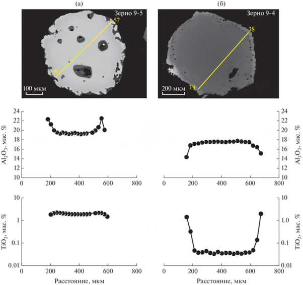 | По Al2O3 | Зональности нет, содержание Al2O3 в основном 0.010–0.018 мас. % | Зональность нечеткая, в основном падение от центра к краю, центральные части – Al2O3 > 0.020 мас. %, края – меньше |