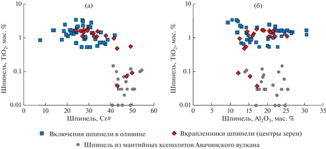 Ключевой особенностью ксенокристов шпинели является их крайне низко-Ti состав (TiO2 < < 0.1 мас. %), отсутствие расплавных включений и наличие резко зональной краевой каймы (рис. 8б). Особенности состава этих шпинелей соответствуют типичным составам этого минерала в мантийных ксенолитах в породах Авачинского вулкана (рис. 9) и, вероятно, они являются продуктами дезинтеграции подобных ксенолитов.