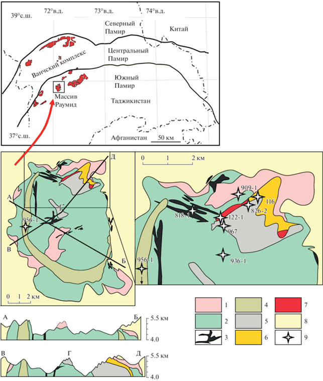 Расположение массива Раумид и его геологическая схема по (Волков, 1990). 1–7 – (γ1–γ7) фазы внедрения гранитов, 8 – вмещающие породы, 9 – локализация образцов, обсуждаемых в настоящей работе. Граниты γ8 фазы внедрения представлены мелкими телами, которые не различимы в масштабе данной схемы.