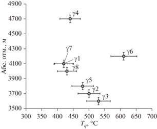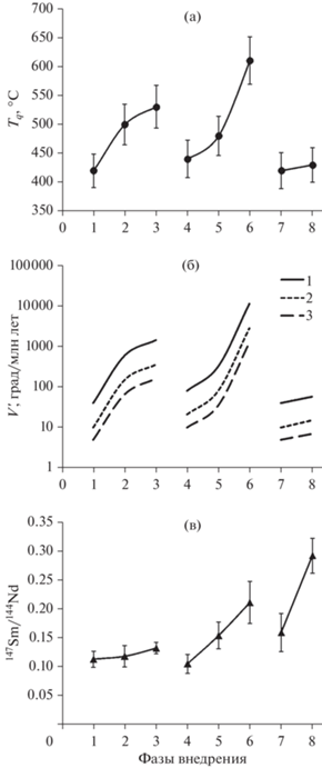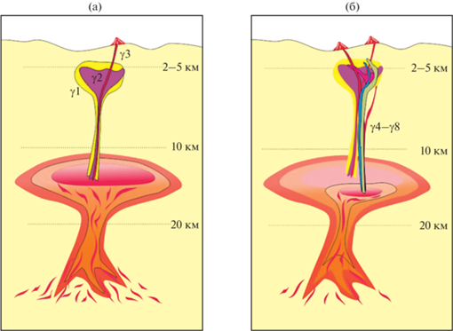 Приведенные данные позволяют предложить непротиворечивую схему поэтапного развития событий, которые привели к формированию гранитного массива Раумид (рис. 15). К первому этапу относится внедрение гранитов γ1–γ3 фаз, ко второму – всех остальных, хотя можно полагать, что граниты γ7 и γ8 представляют отдельный, третий этап (Волков и др., 2016). Судя по близким изотопным (εNd, δ18О) и геохимическим параметрам, источником расплавов всех фаз внедрения являлась примерно одна и та же зона утолщенной континентальной коры, сложенная Bt-содержащими метаморфическими породами. Магматическая камера, где протекала кристаллизационная дифференциация кислых расплавов, могла находиться на глубине 10–20 км. Основной этап ее разгрузки (γ1–γ3) произошел после кристаллизации 20–40% расплава, после чего камера частично заполнилась новой порцией расплавов, поступивших из того же источника. Далее процесс кристаллизационной дифференциации повторился и дошел до ее более высоких степеней (60–85%), после чего имел место второй, и, возможно, третий этапы разгрузки магматической камеры. Опубликованные данные изучения Sm-Nd системы гранитов массива Раумид согласуются с приведенной схемой, и показывают, что на каждом этапе поступления расплавов из источника повышалось изотопное Sm/Nd отношение (Волков и др., 2016), т.е. в зоне частичного плавления происходило своеобразное исчерпание источника в отношении легких РЗЭ.