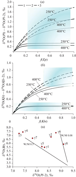 Все минеральные фракции для изотопного анализа кислорода отбирались вручную под микроскопом. Отбор фракций биотита (Bt), хлоритизированного биотита (Bt-Chl) и хлорита (Chl) для изотопного анализа контролировался по цвету зерен. Неизмененный Bt в гранитах массива Раумид имеет красно-коричневый цвет, Chl является ярко-зеленым, а зерна Bt-Chl – зеленовато-бурые. При отборе фракций полевых шпатов были хорошо различимы измененные замутненные зерна Pl и Kfs (рис. 2в, 2г). Анализ под электронным микроскопом показал, что измененные зерна Pl имеют микровключения эпидота (цоизита) и серицита, а измененный Kfs содержит агрегаты каолинита на поверхности кристаллов (рис. 2д, 2е). Мы присвоили измененным разновидностям Pl и Kfs обозначения Pl-2 и Kfs-2, чтобы отличать их далее от визуально неизмененных разностей Pl и Kfs. Постмагматические изменения в гранитах γ5–γ8 фаз внедрения также проявлены и в развитии Chl по зернам Bt (рис. 2ж). В породах γ5 и γ8 присутствуют следовые количества мусковита, имеющего, по-видимому, автометаморфическое происхождение (рис. 2з). Мономинеральные фракции Chl и Ms также были отобраны для изотопного анализа.