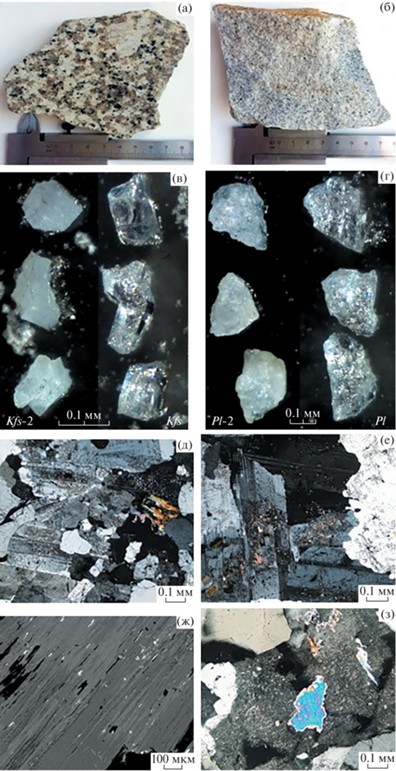 Породы массива Раумид. (a, б) – внешний вид порфировых (γ2) и афировых (γ8) гранитов; (в, г) – фото неизмененных и измененных зерен плагиоклаза (Pl, Pl-2) и калиевого полевого шпата (Kfs, Kfs-2), отобранных для изотопного анализа кислорода; (д, е) – фото шлифов под микроскопом: (д) – измененные зерна плагиоклаза c микровключениями эпидота (цоизита) и серицита (обр. 314, γ3), (е) – измененный КПШ с агрегатами каолинита на поверхности кристаллов (обр. 920, γ2); (ж) – развитие хлорита по зернам биотита (обр. 951-1, γ4, фото под электронным микроскопом в обратнорассеянных электронах); (з) – мусковит, сформированный на этапе автометаморфизма (обр. 826, γ5, изображение с помощью поляризационного микроскопа, николи скрещены).