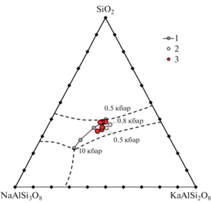 Породы массива Раумид на диаграмме Qz‒Ab–Or. 1 – точки минимумов, соответствующих насыщенному водой расплаву при 0.5, 1, 2, 5 и 10 кбар (Luth et al., 1964); 2 – точки безводных минимумов при 0.5 и 0.8 кбар (Holtz et al., 2001); 3 – граниты γ1–γ8 фаз внедрения массива Раумид.