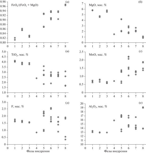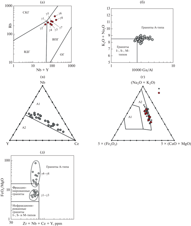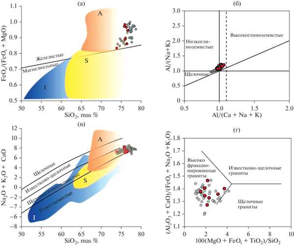 Породы массива Раумид являются высококремниевыми: содержание SiO2 в образцах γ2–γ8 фаз внедрения изменяется от 75.73 до 76.55 мас. %, и только в гранитах γ1 оно немного снижено (73.83 мас. %, табл. 2). Состав всех пород массива близок к гранитной эвтектике (рис. 3), точки всех фаз внедрения компактно расположены на тройной диаграмме Qz–Ab–Or в поле недосыщенных водой гранитных расплавов, кристаллизующихся на небольших глубинах. На диаграмме Fe–SiO2 граниты массива Раумид уверенно попадают в поле пород железистого типа (рис. 4а). Их железистость является высокой (Fe* = 0.8–1.0)33, но она определяется не столько высоким содержанием железа, сколько низким содержанием магния (MgO от 0.38 для γ1 до <0.2 для γ2–γ8, табл. 2). На классификационной диаграмме MALI–SiO2 (Frost et al., 2001) породы массива Раумид попадают в поле известково-щелочных гранитов (рис. 4б), их насыщение алюминием (A/CNK = 0.88–1.06; ASI = 0.93–1.13) является умеренным (рис. 4в), а по соотношению основных породообразующих оксидов (Sylvester, 1989), они относятся к фракционированному типу (рис. 4г). Индекс дифференцированности пород массива является высоким (от 94.8 для γ1 до 98.1 для γ8).
