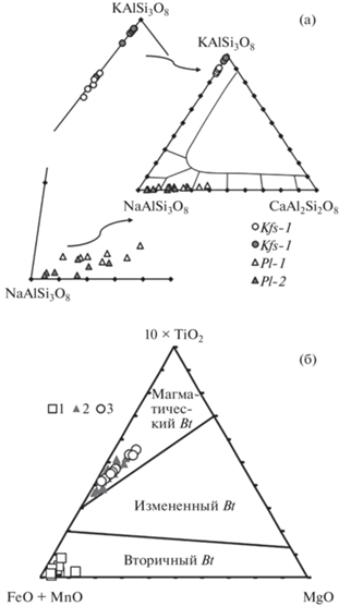 Pl и Kfs. Составы Pl и Kfs изучены в порциях минералов, подготовленных для изотопного анализа кислорода. Составы Pl и Kfs отвечают олигоклазу (0 < An < 20%) и ортоклазу соответственно (табл. 3, рис. 5а). Они не обнаруживают корреляции с последовательностью фаз внедрения гранитов, но изменяются при переходе от неизмененной разности к измененной (Pl → Pl-2 и Kfs → Kfs-2). Этот переход сопровождается выносом Na из Kfs (составы сдвигаются в сторону чистого ортоклаза и привносом Na в Pl (сдвиг составов в сторону альбита, рис. 5а)). Одновременно происходит обеднение Ca и K в Pl-2 и повышение содержания калия в Kfs-2. Комплементарное перераспределение К и Na между Pl и Kfs указывает на возможность обмена K и Na между этими минералами в закрытой системе.