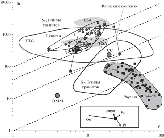 Геохимические черты гранитов массива Раумид описываются процессами “глубоко протекавшей фракционной кристаллизации фельзитовых магм без очевидных следов контаминации” (Костицын и др., 2007а). Действительно, процессов контаминации, выраженных в сдвигах изотопного или элементного состава, для гранитов массива Раумид не было установлено. Тем не менее в породах трех фаз внедрения из пяти присутствуют ксенолиты как окружающих, так и более глубинных пород (ороговикованных песчаников и сланцев в γ1 и γ2, пород основного состава в γ1, гнейсов и аляскитов в γ4, Волков, Негрей, 1974). Однако, по-видимому, процесс захвата ксенолитов не сопровождался их ассимиляцией или реакционным взаимодействием с гранитными расплавами. Согласно опубликованным результатам ICP-MS анализа содержаний микроэлементов в 58 образцах гранитов массива Раумид, при переходе от пород первой фазы внедрения к последней (т.е. в ряду γ1–γ8) происходит эволюция микроэлементного состава гранитов. Она состоит в существенном накоплении Ta (2 → 62 ppm), Nb (27 → 106 ppm), Rb (170 → 440 ppm), Pb (25 → → 85 ppm), Y (18 → 120 ppm), HREE, U (6 → 30 ppm), Be (5 → 25 ppm), Cs (5 → 11 ppm) и Hf (2 → 9 ppm). Одновременно отмечается снижение содержаний Ba (320 → 16 ppm), Sr (127 → 2 ppm), Th (85 → → 18 ppm), Zr (207 → 30 ppm) и LREE. В том же ряду происходит нарастание величины отрицательной Eu-аномалии, примерно на порядок для γ8 по сравнению с γ1. Общий вид спектров REE при переходе от γ1 к γ8 изменяется не только в сторону увеличения отрицательной Eu-аномалии, но и в сторону уменьшения концентраций LREE и умеренного возрастания HREE. Значение La/Lu, нормированное на хондрит, уменьшается от 10–15 в гранитах γ1 до 0.2–1 в гранитах γ8 (Костицын и др., 2007а). Изотопное отношение (87Sr/86Sr)0 варьирует в гранитах массива Раумид от 0.7067 до 0.7106 (Шатагин, Волков, 2020), в то время как величина εNd(T) остается постоянной (–4.0, Волков и др., 2016).