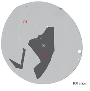 Характерный вид образцов: кристалл циркона (Zrn), вплавленный в высокотитанистое стекло (Gl). Фото в обратнорассеянных электронах с инверсией черно-белого изображения. Крестиком показано место контрольного измерения TiO2 в цирконе на расстоянии около 250 мкм от контакта циркон–стекло.