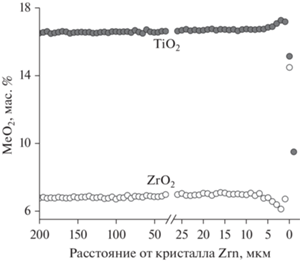 Вдали от кристаллов стекло гомогенно в пределах ошибки во всех образцах, его состав (средний по 15 измерениям), в мас. %: 50.3 SiO2, 16.3 TiO2, 8.9 Al2O3, 7.7 MgO, 8.4 CaO, 6.9 ZrO2. В экспериментах при 1450 и 1470°С уже в 200 мкм от цирконов наблюдается незначительное увеличение содержания циркония в стекле, достигающее 7.6 мас. % ZrO2 на границе с кристаллами. Возможно, это связано с некоторым растворением кристаллов циркона. Эксперимент при 1430°С демонстрирует практически неизмененный профиль в стекле на границе с цирконом (рис. 2). Именно в этом образце тщательно измерен профиль TiO2 в цирконе.