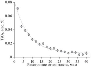 Характерный профиль кажущегося содержания титана в цирконе от границы стекло/циркон вглубь кристалла показан на рис. 3. Экспериментальные точки неплохо (R2 = 0.975) описываются уравнением: