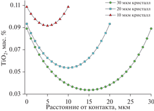 где х – расстояние от границы стекло/кристалл (мкм). Заметим, что в нашем случае проведено измерение от стекла вглубь огромного (с точки зрения экспериментатора) кристалла циркона, где вторичная флюоресценция от стекла с противоположного края кристалла пренебрежимо мала. В реальном эксперименте столь большие кристаллы невозможны, да и нежелательны, поскольку время достижения равновесия кристалл/расплав резко возрастает с величиной кристалла. На рис. 4 показаны профили от стекла до стекла через кристаллы циркона шириной 10, 20 и 30 мкм, обычные в экспериментальной практике. Кажущееся содержание TiO2 в цирконе рассчитано по уравнению (1). Очевидно, что кристаллы менее 10 мкм непригодны для анализа. В краевых частях крупных кристаллов кажущееся содержание TiO2 может составлять 0.06–0.09 мас. %. Наши предварительные эксперименты показали, что содержание TiO2 в кристаллах циркона, равновесных с высокотитанистым расплавом (14–18 мас. %) составляет около 0.5 ± 0.1 мас. %. Таким образом, ошибки за счет вторичной флюоресценции от окружающего стекла достигают 10–23%. В настоящем исследовании содержание TiO2 в стекле составляет 16 мас. %. Очевидно, что при более низких концентрациях TiO2 в стекле и вторичная флюоресценция от него должна быть пропорционально ниже. С одной стороны, это справедливо для вторичной флюоресценции Ca и Ti от стекла в кристаллах оливина (Gavrilenko et al., 2022). С другой стороны, в предположении постоянного коэффициента распределения Ti между цирконом и расплавом, более низкое содержание TiO2 в стекле должно приводить и к более низкому содержанию Ti в цирконе, оставляя возможную ошибку в определении истинного содержания титана в цирконе примерно на том же уровне.