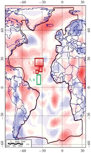 Горизонтальный срез объемных вариаций скоростей распространения сейсмических S-волн вдоль оси простирания САХ на глубине 300 км, рассчитанный в работе (Дмитриев, Соколов, 2003) по данным цифровой сейсмотомографической модели TX2011 (Grand, 2002), находящейся в открытом доступе (https://ds.iris.edu/spud/earthmodel/10131216). Красным цветом показаны отрицательные аномалии, связанные с понижением сейсмических скоростей в “горячих” сегментах, синим цветом – положительные аномалии “холодных” сегментов. Красными прямоугольниками обозначены районы осевой зоны САХ с широким распространением продуктов базальтового магматизма, где были получены образцы закалочных стекол, соответствующие группам 1–4 в табл. 1. Зеленые прямоугольники очерчивают районы САХ, в которых океанический фундамент сложен преимущественно перидотитами и где были добыты образцы закалочных стекол групп 5–6.