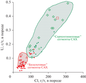 В противоположность этому, в закалочных стеклах из сегментов САХ, где распространены серпентиниты, установлены широкие вариации содержаний Cl и U и их положительная корреляция с концентрацией Sr. Следует заметить, что поскольку уран и стронций характеризуются резко различающимися коэффициентами распределения минерал/расплав (Sun et al., 2017), тренд, наблюдаемый на рис. 8б для составов стекол из этих сегментов САХ, не связан с эффектом фракционной кристаллизации и, возможно, отражает контаминацию расплава гидротермальным флюидом – дериватом морской воды. Точки состава закалочных стекол группы E-MORB, добытых из серпентинитовых сегментов САХ, на рис. 9 занимают гораздо более обширное поле, по сравнению с составами закалочных стекол N-MORB, и существенно превосходят их по содержаниям Cl и U. Четко выраженная на рис. 10 положительная корреляция между содержаниями Cl и U в обогащенных закалочных стеклах, так же как и U-Sr тренд, свойственный тем же образцам на рис. 8б, возможно, отражает контаминацию родительских расплавов MORB компонентами морского происхождения.