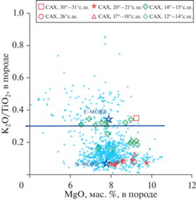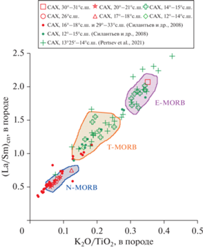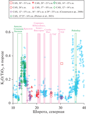 Характер распределения вдоль оси САХ между 10° и 40° с.ш. величины K2O/TiO2 в закалочных стеклах MORB. Голубые крестики соответствуют составам, заимствованным из (RIDGE …, 1999). Красным цветом и его оттенками обозначены районы осевой зоны САХ, в которых расположены гидротермальные поля, связанные с базальтовым субстратом и точки составов изученных закалочных стекол, добытых в этих районах. Зеленым цветом показаны районы гидротермальных полей, ассоциирующих с серпентинитами и составы изученных закалочных стекол из этих акваторий. Зеленые тонкие крестики – составы закалочных стекол, представленные в (Pertsev et al., 2021). Сиреневые крестики – составы закалочных стекол, представленные в (Силантьев и др., 2008).