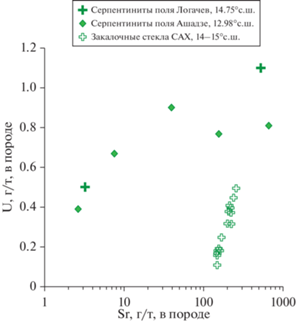 Вариации содержаний U и Sr в изученных закалочных стеклах MORB и в ассоциирующих с ними серпентинитах из сегментов САХ, заключенных между 12о и 15о с.ш. Состав серпентинитов заимствован из (Силантьев и др., 2011).