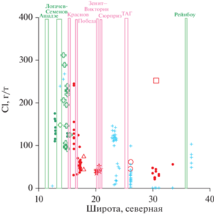 Вариации вдоль оси САХ между 10° и 40° с.ш. содержания Cl в закалочных стеклах MORB. Условные обозначения см. на рис. 2 и 4.