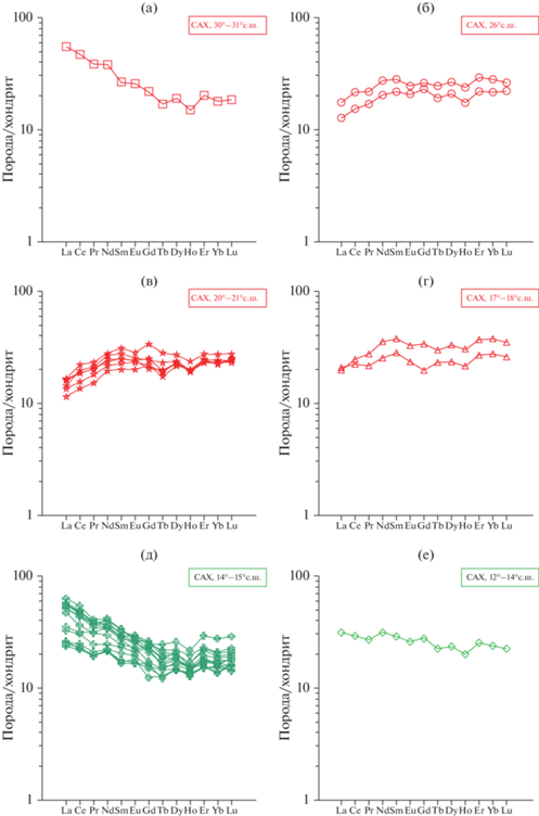 Изученные образцы закалочных стекол были отобраны в шести районах осевой зоны САХ, расположенных в пределах ее простирания между 12° и 30° с.ш. (табл. 1, рис. 1). Cогласно работам (Hemond et al., 2006; Sokolov et al., 2020), эти районы характеризуются различным строением разреза океанической коры и по преобладающему типу слагающих пород могут быть подразделены на две главные группы. Одна из них включает сегменты САХ, в строении которых преобладают базальты (30°–31° с.ш., 26о с.ш., 16°–18° с.ш.). К другой группе относятся сегменты, в пределах которых распространены обнажения серпентинитов с подчиненными телами габброидов (20°–21° с.ш., 14°–15° с.ш., 12°–14° с.ш.).