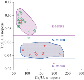 Предложенная модель, вероятно, может конкурировать с представлениями о происхождении E-MORB в сегментах САХ между 14°–15° с.ш. и на 30° с.ш. за счет рециклинга щелочных базальтов типа OIB (например, Hemond et al., 2006). К этому можно добавить, что ранее в работе (Yang et al., 2018) был предпринят анализ характера распределения более 60 элементов в 319 образцах закалочных стекол D-MORB, N-MORB и E-MORB из 144 отдельных лавовых покровов из сегментов рифтовой долины САХ между 10° и 40° с.ш. Представленные в этой работе результаты продемонстрировали, что отношения содержаний редких элементов, “чувствительных” к флюидному транспорту в зонах субдукции (Th/U, Nb/U, Ba/Th, Ba/La), характеризуются постоянством и аналогичны их мантийным значениям для N- и E‑MORB. Таким образом, полученные в (Yang et al., 2018) данные свидетельствуют о необходимости переоценки моделей петрогенезиса, объясняющих обогащение родительских расплавов MORB за счет процесса рециклинга.