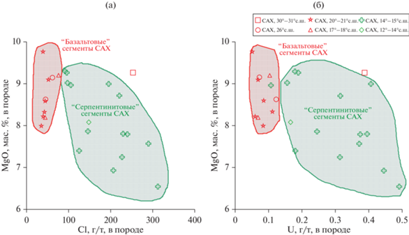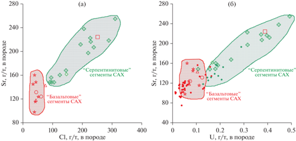 В ходе серпентинизации ультраосновной субстрат океанической коры усваивает из флюида морского происхождения значительные количества хлора, стронция и урана (Силантьев, 2003; Sharp, Barnes, 2004). Об уровне вариации содержаний Sr и U в серпентинитах, ассоциирующих с закалочными стеклами, добытых между 12° и 15° с.ш., можно судить по рис. 12. Характер трендов распределения содержаний Cl и U в обогащенных закалочных стеклах, представленных на рис. 8–10, возможно, отражает специфику состава ассоциирующих серпентинитов, которые являются преобладающим типом пород в этих сегментах, а проявления базальтового магматизма здесь крайне редки. Свидетельства участия in situ гидротермального компонента в эволюции магматического расплава, родительского для MORB рифтовой долины САХ, ранее были приведены в работах (Kendrick et al., 2012; Stroncik, Niedermann, 2016; Buikin et al., 2022). На рис. 13 наглядно представлен характер распределения содержания хлора в закалочных стеклах МORB из сегментов САХ, заключенных между 10° и 40° с.ш. Очевидна приуроченность закалочных стекол с высоким содержанием хлора к районам осевой зоны хребта, сложенным серпентинитами, в которых расположены так называемые “serpentinite hosted” гидротермальные поля. В противоположность стеклам, относящимся к группе E-MORB, образцы деплетированных закалочных стекол (N-MORB), как следует из рис. 11 и 13, расположены в базальтовых сегментах осевой зоны САХ, к которым приурочены гидротермальные поля, ассоциирующие с базальтами (“basalt hosted”). Судя по приведенным выше данным, признаки внутрикоровой контаминации в стеклах этой группы отсутствуют.