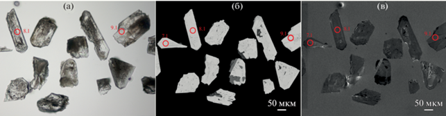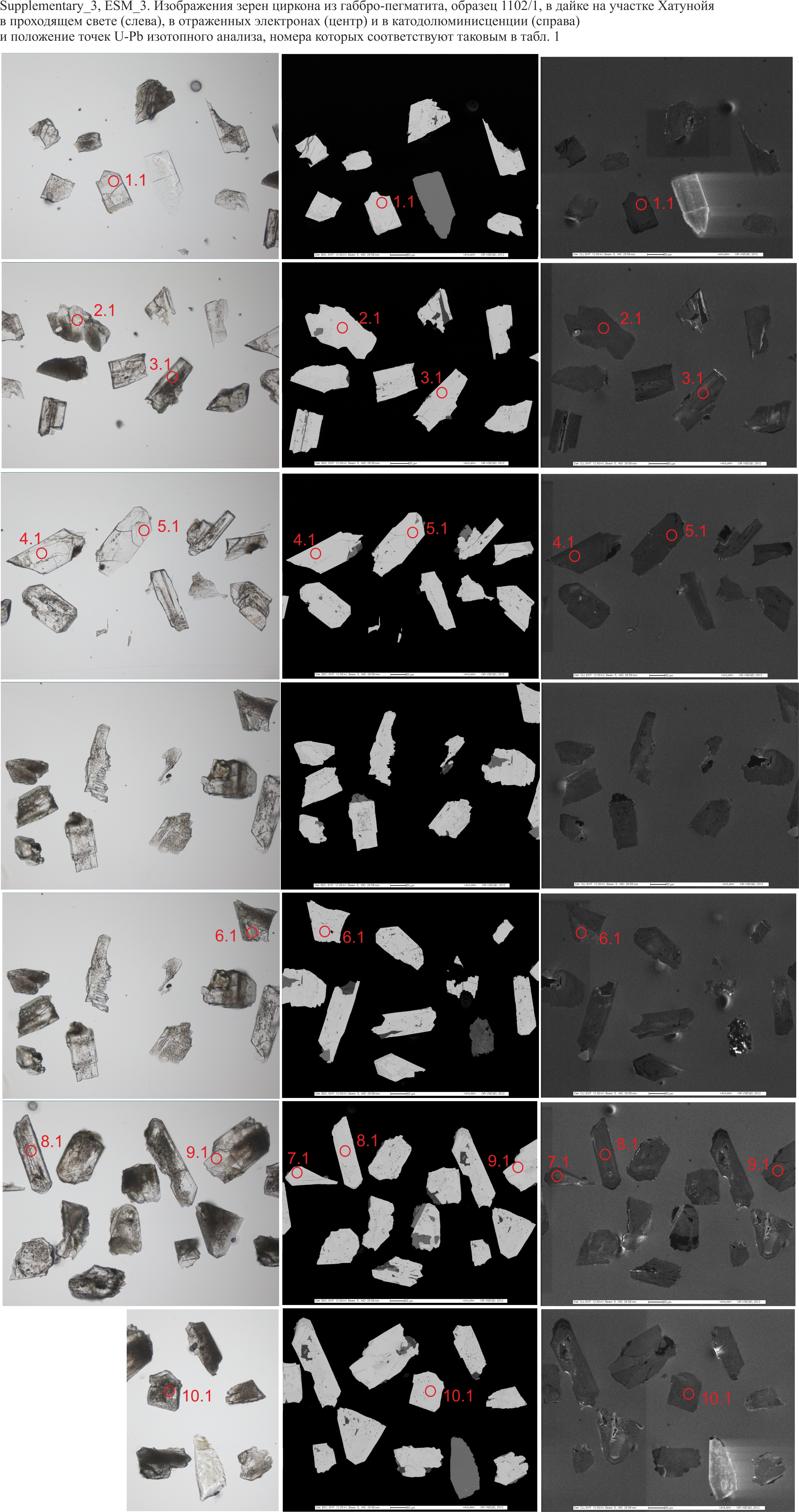 Микрофотографии кристаллов циркона из габбро-пегматита (обр. 1102/1) на участке Хатунойя в проходящем свете (а), в обратно-отраженных электронах (б) и в катодолюминисценции (в). Фотографии всех зерен циркона с положением датированных точек см. в Supplementary 3, ESM_3.jpg.