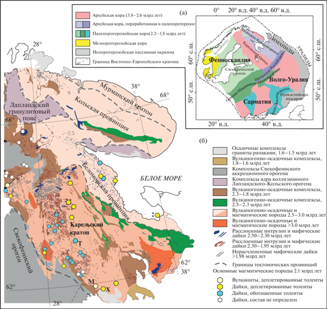 Карельский кратон – блок архейской континентальной коры. Он выведен на поверхность на юго-востоке Фенноскандинавского щита (рис. 1), его южная и восточная окраины перекрыты осадочным чехлом Восточно-Европейской платформы (Bogdanova et al., 2016).