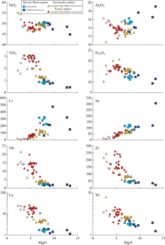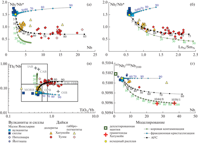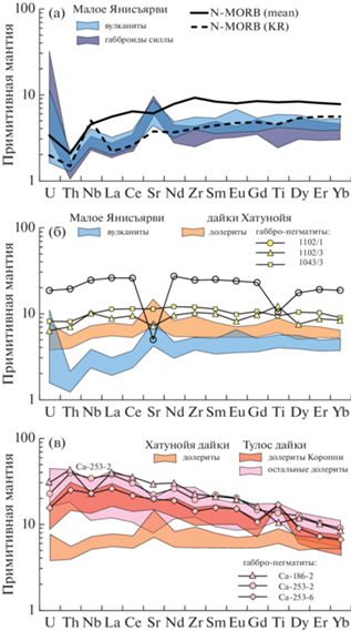 На участке Малое Янисъярви мелкозернистые метабазиты с подушечными и массивными текстурами, которые рассматриваются как метавулканиты, отвечают толеитовым базальтам. Породы имеют узкий интервал содержания MgO 8.3–6.8 мас. %, незначительные вариации большинства петрогенных и редких элементов и очень низкие концентрации всех несовместимых элементов (рис. 7; Supplementary 2, ESM_2.xlsx). Общей особенностью метавулканитов являются сильно деплетированные спектры легких РЗЭ (LaN/SmN от 0.41 до 0.73), нефракционированные спектры тяжелых РЗЭ (GdN/YbN от 0.97 до 1.2) и резкие положительные аномалии ниобия (Nb/Nb* от 1.5 до 1.7) и стронция (рис. 8а; Supplementary 2, ESM_2.xlsx). По концентрациям несовместимых элементов и характеру распределения РЗЭ метавулканиты сопоставимы с наиболее деплетированными базальтами срединно-океанического хребта Колбейсей (рис. 8а).