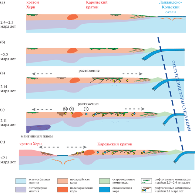 Все исследователи связывают раскол западной части Карельского кратона около 2.1 млрд лет назад с подъемом мантийного плюма (Nykänen et al., 1994; Kohonen, 1995; Lahtinen et al., 2015; Köykkä et al., 2019). Такая геодинамическая модель, однако, оставляет без ответа вопрос о механизме утонения и растяжения литосферы, который мог бы обеспечить площадное распространение на Карельском кратоне деплетированных толеитовых базитов, близких по геохимии к N-MORB (Stepanova et al., 2014), и полное отсутствие таких базитов на всех остальных кратонах, входивших до раскола в суперкратон Сьюпериа (Davey et al., 2022).