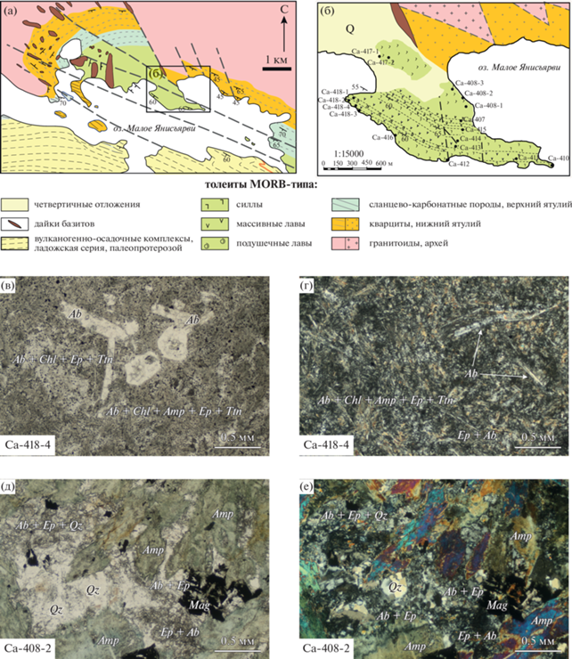 Геологическое строение и петрографические характеристики пород на участке Малое Янисъярви. (а) – геологическая карта района оз. Малое Янисъярви по данным (Кратц, 1963; Хейсканен, 1980); (б) – схема геологического строения и положение метабазитов на мысе Хапаниеми по данным (Голубев, Светов, 1983) с упрощениями и с положением точек опробования, номера точек соответствуют номерам образцов в статье и Supplementary 2, ESM_2.xlsx; (в)–(е) фотографии прозрачных шлифов иллюстрируют структурные особенности пород: (в, г) – метавулканиты (в плоскополяризованном проходящем свете (PPL)) и (д, е) – метагабброиды (в PPL и скрещенных николях (XPL)). Здесь и далее аббревиатура минералов по (Warr, 2021).