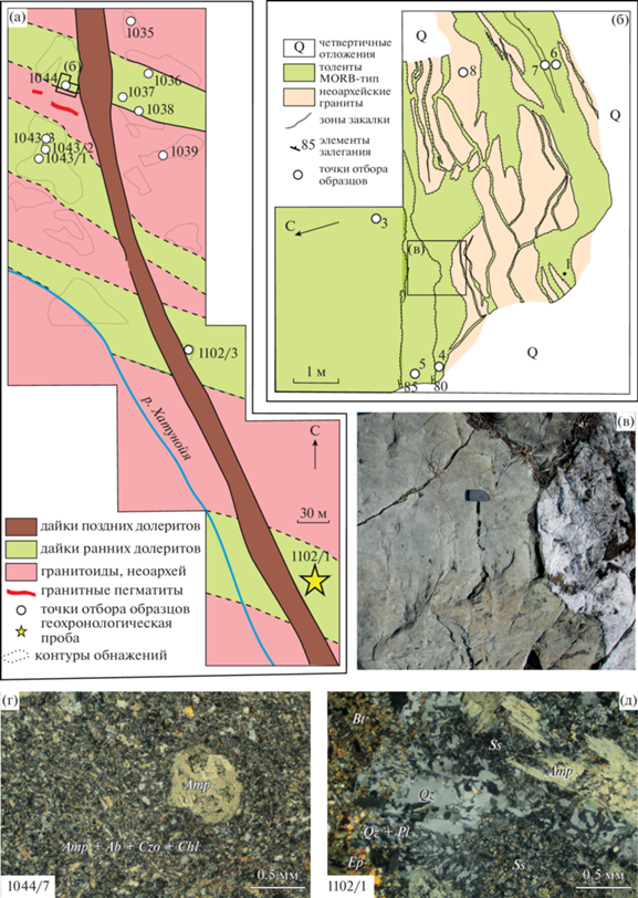 Ранние дайки изучались на участке размером 450 × 250 м, где среди неоархейских гранодиоритов вскрыто несколько субпараллельных тел близкого северо-западного (285°) простирания мощностью от 20 до 60 м, прослеженных на протяжении 250 м. Одна из даек на участке Хатунойя мощностью около 20 м характеризуется наличием в восточном и западном контактах ветвящихся апофиз сложной морфологии (рис. 3а, 3б). Часть даек имеет сложное многофазное внутреннее строение и текстуры типа “дайка в дайке”: в них установлено по две–три системы зон закалки в каждом из контактов (рис. 3б, 3в). Зоны закалки крупных тел и тонкие апофизы сложены тонкозернистыми порфировидными породами, в фенокристовой ассоциации которых (судя по вторичным минералам) существенно преобладал клинопироксен (рис. 3г).