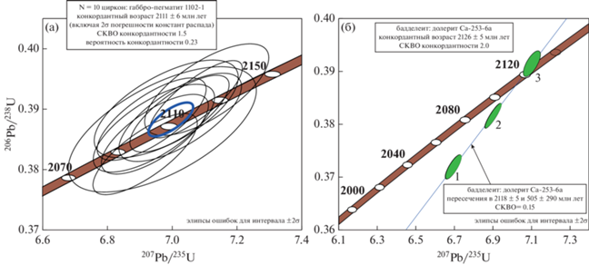 Диаграммы с конкордией для циркона из габбро-пегматита ранней дайки на участке Хатунойя (а) и бадделеита из крупнозернистого долерита на участке Тулос (б).