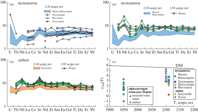 Основной объем таких исследований был выполнен для морского ятулия на территории Финляндии в сланцевых поясах провинции Хойтиайнен, Кайну и Кииминки Раахе-Ладожской зоны (Nykänen et al., 1994; Kohonen, 1995; Peltonen, 2005; Lahtinen et al., 2010, 2015), а также в ее северном продолжении в вулканогенно-осадочных поясах Перяпохья, Куусамо и Центрально-Лапландском (Köykkä et al., 2019). По результатам изучения осадочных и магматических комплексов на западной окраине Карельского кратона установлены два эпизода рифтогенеза и раскола континентальной литосферы. На раннем этапе (2.10–2.15 млрд лет) сформировались рифтогенные осадки и связанные с ними малоглубинные деплетированные толеитовые базальты: он рассматривается как раскол континентального блока, открытие океана и формирование пассивной окраины на западе Карельского кратона (Huhma et al., 1990; Nykänen et al., 1994; Kohonen, 1995; Lahtinen et al., 2010, 2015; Köykkä et al., 2019). Поздний эпизод, около 1.95 млрд лет, маркируется офиолитовыми комплексами Йорма и Оутокумпу (Peltonen et al., 1996; Peltonen, 2005) и связывается с повторным расколом утоненной литосферы уже сформированной пассивной окраины (Lahtinen et al., 2010, 2015).
