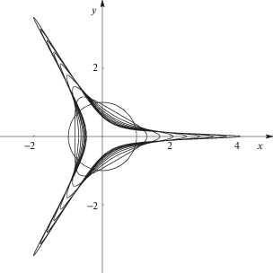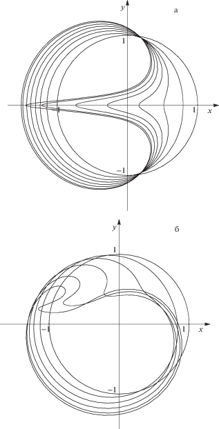 Силы тяжести и поверхностного натяжения во всех трех задачах отсутствовали. Каждой кривой на рисунках соответствует положение свободной границы в один из моментов времени. В совокупности они демонстрируют возникновение и развитие кумулятивных струй. При этом для получения рис. 1а, б использовалось всего 128 точек сетки, а для рис. 2 – 192 точки. Можно заметить, что точки распределялись на границе неравномерно и были размещены ближе друг к другу там, где возникали струи.