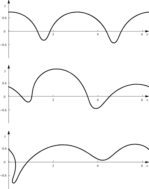 Сохранение формы профиля было экспериментально проверено в численном алгоритме в качестве теста. Рассматривалась волна Крэппера, заданная значением параметра b = 0.3. Ее достаточно сложная форма изображена на первом рис. 4. Для аппроксимации границы использовалось $N = 32$ точек сетки, распределенных равномерно по параметру $\alpha $. Для расчетов использовался фиксированный шаг по времени $\Delta t = 0.0{\text{1}}$. Сравнивались значения пространственных координат с интервалом $T = 100$. Невязка определялась в виде