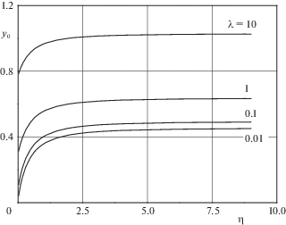 Функции ${{y}_{0}}\left( 1 \right)$ и $y_{0}^{'}(1)$ связаны соотношением (4.14) и поэтому имеют разный порядок малости по параметру $\lambda $. Для определения порядков этих функций проведем численное решение задачи (4.13)–(4.15) при малых $\lambda $. На рис. 6 показано решение этих уравнений при $\lambda = {{10}^{{ - 6}}}$ (сплошная кривая) и $\lambda = {{10}^{{ - 3}}}$ (точки). Видно, что зависимости ${{y}_{0}}\left( {\eta ,\lambda } \right)$ в этих случаях близки друг к другу. В пределе при $\lambda \to 0$ обозначим значение ${{y}_{0}}\left( \eta \right)$ через ${{y}_{{00}}}\left( \eta \right)$. Из численного решения получаются величины, которые имеют порядок $O(1)$: $y_{{00}}^{'}\left( 1 \right) = {{d}_{1}} \approx 1.3641$, ${{y}_{{00}}}\left( \infty \right) = {{d}_{2}} = 0.4450$. Подставляя эти значения в формулу (4.16), получаем