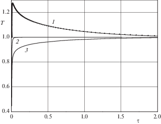 $\gamma = 1,\quad F = {{F}_{*}} = \frac{{T_{*}^{2}}}{{T_{0}^{2}}},\quad v = 0\quad \left( {\eta = 1} \right)$В области ${{G}_{2}}$ $\left( {0 < \tau < \infty } \right)$